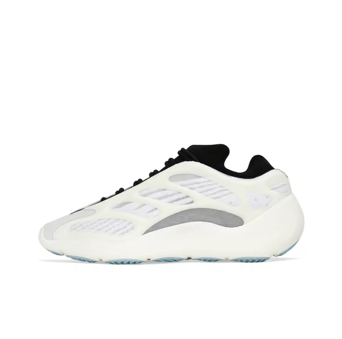 The Adidas Yeezy 700 V3 “Azael” is one of the most iconic colorways in the Yeezy V3 lineup. It features a white engineered mesh upper wrapped in a semi-translucent RPU cage that glows in the dark, offering a bold yet minimal aesthetic.
