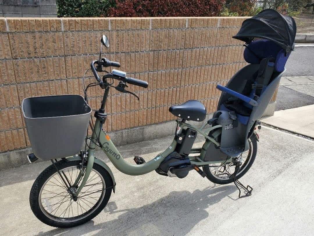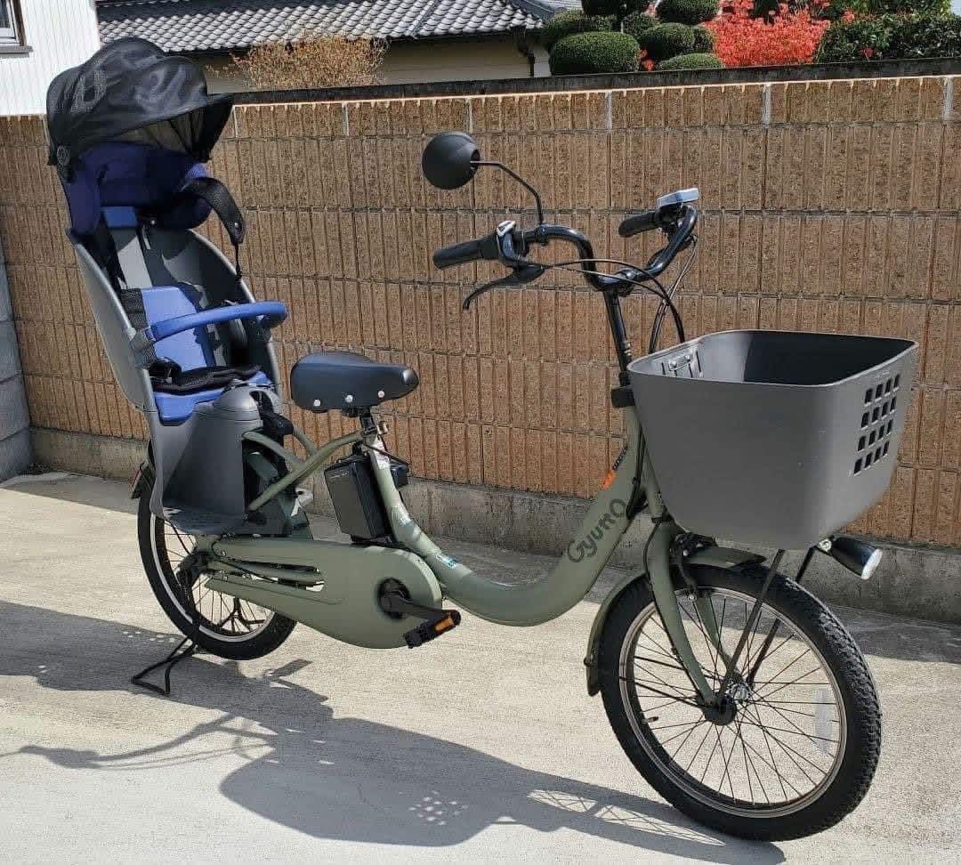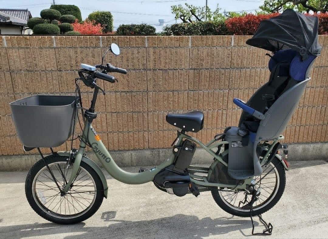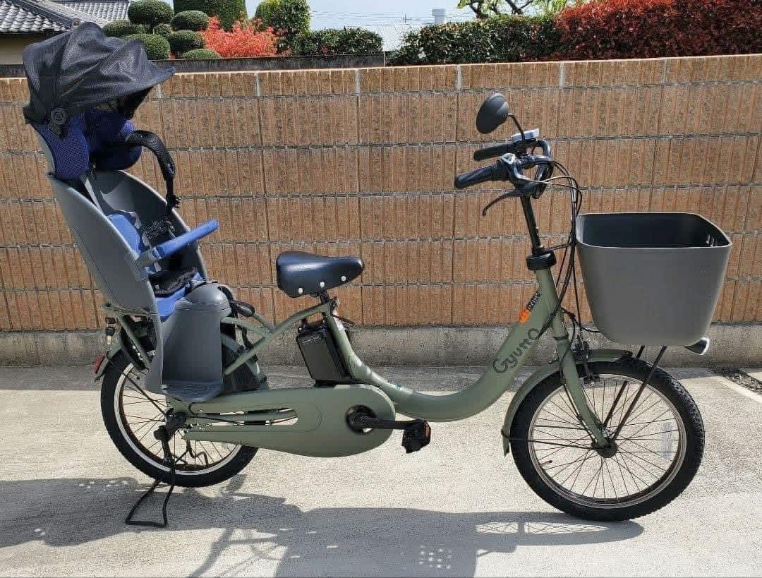 Electric city bicycle with secure child seat and front basket, ideal for parents and daily urban commuting.